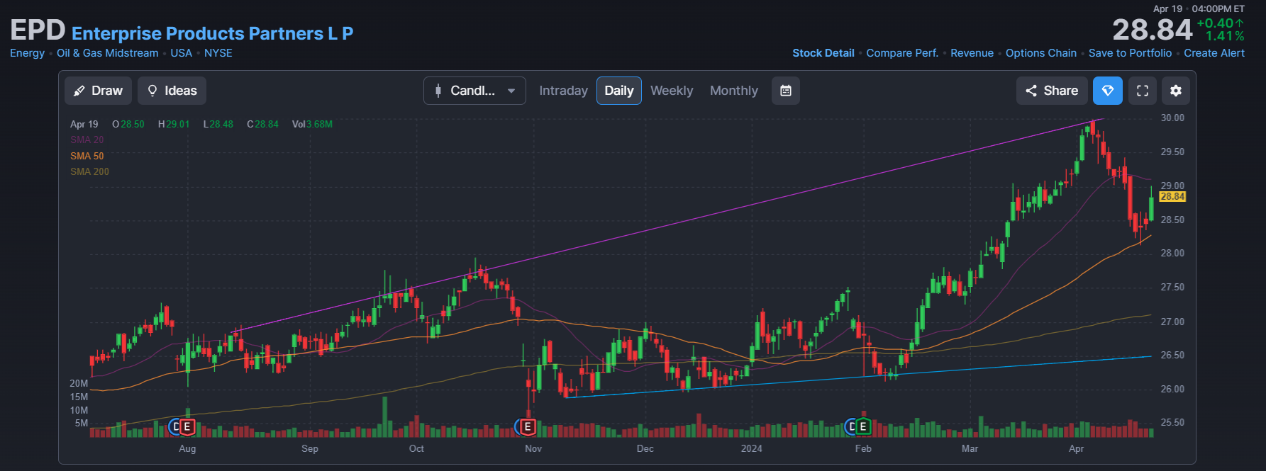 미드스트림 에너지 서비스를 제공하는 EPD는 지난 25년간 연평균 7%씩 배당금을 늘려왔습니다. 4월 5일에는 분기별 배당금을 주당 $0.515로 책정하여 (5월 14일 지급 예정), 전년 대비 5.1% 인상한 배당금을 발표했습니다. 현재 EPD의 배당 수익률은 무려 7.1%에 달합니다.