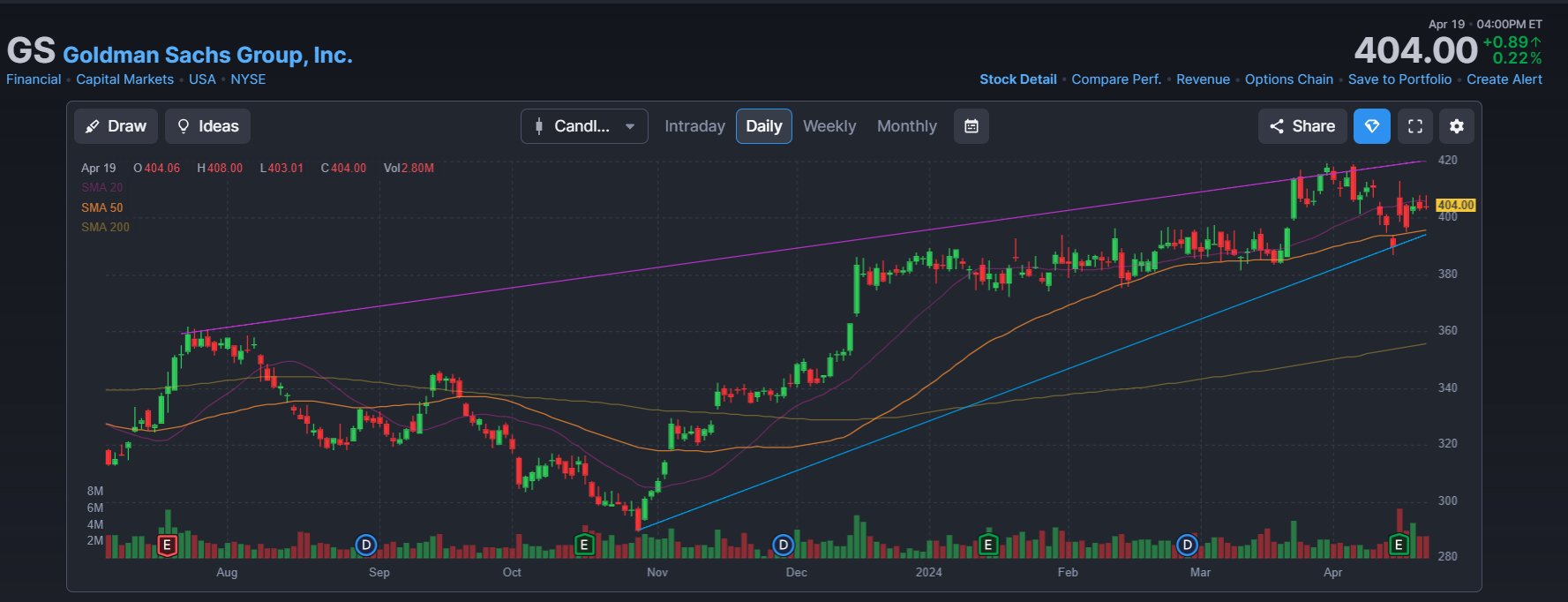 미국을 대표하는 투자은행 중 하나인 골드만 삭스의 최근 1분기 실적은 트레이딩 및 투자은행 수익 증가로 예상을 뛰어넘었습니다. 자본시장 활동이 회복되면서 탄탄한 실적을 냈죠.