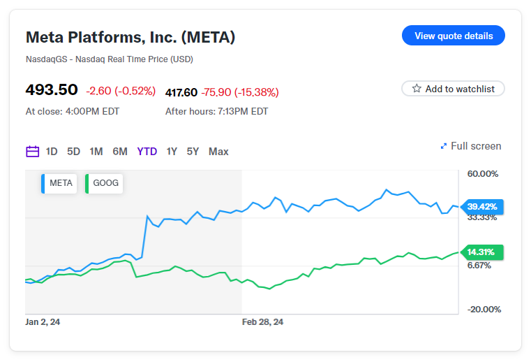 메타 (META)의 1분기 실적은 분석가들의 예상을 웃돌았지만, 실망스러운 2분기 전망이 발표되면서 주가가 15% 이상 폭락했습니다.