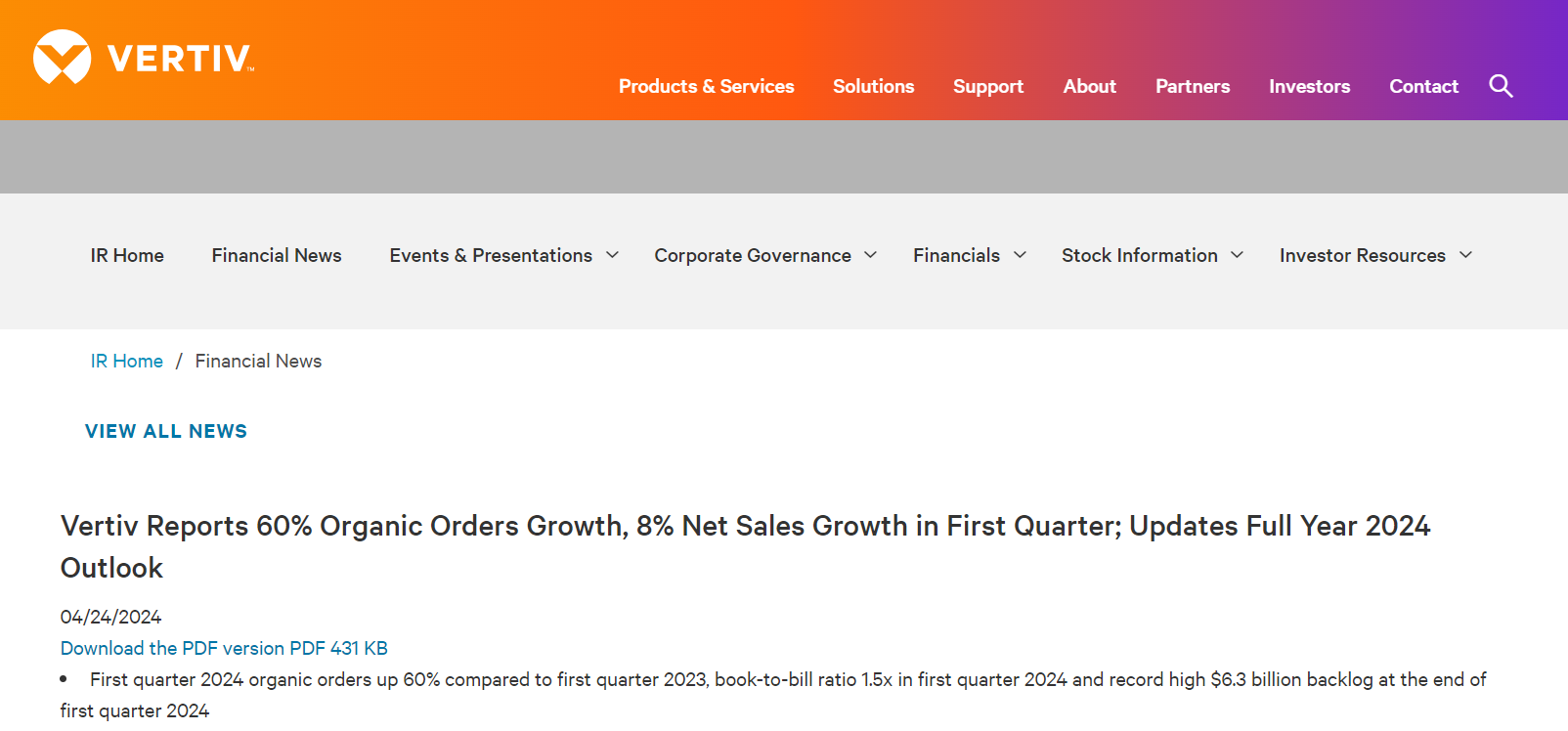 Vertiv Holdings가 2024년 1분기 실적을 발표했습니다. AI 배치의 증가로 인해 시장 수요가 높은 가운데 주문이 예상을 뛰어넘는 성장세를 기록하고 있습니다.