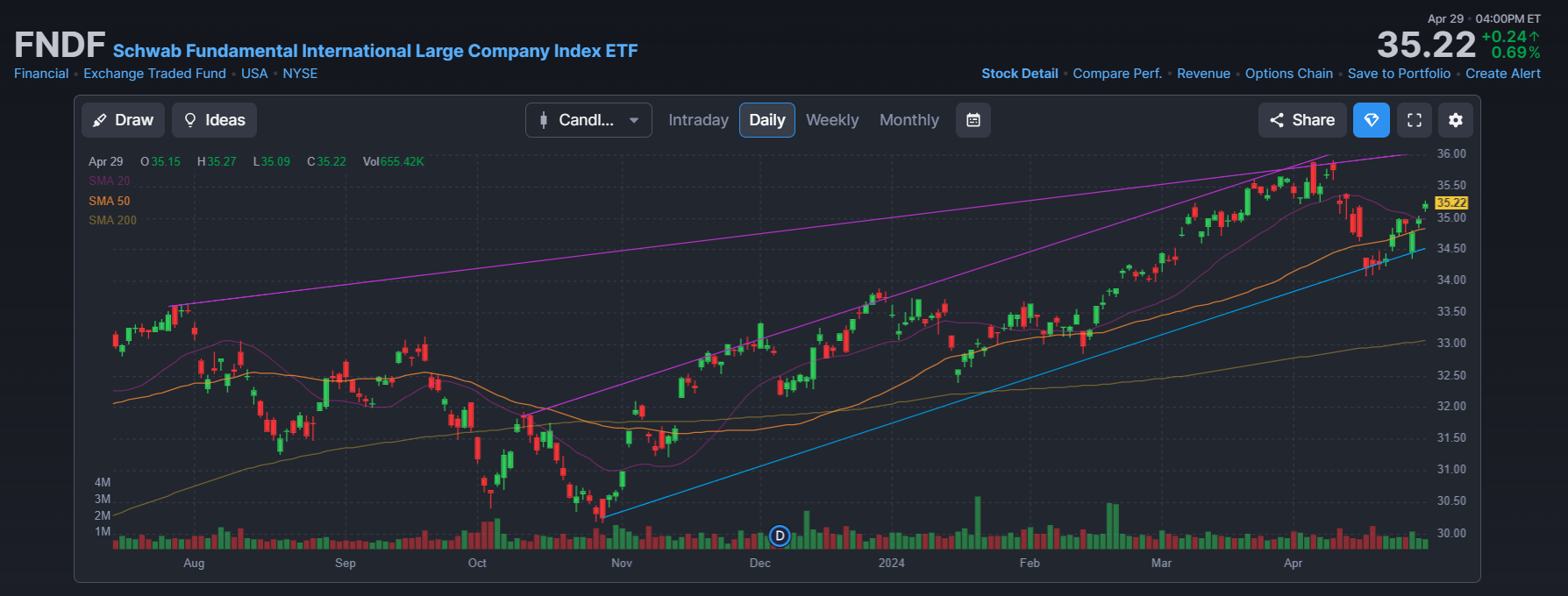 성숙한 세계 시장 기업에 투자하는 슈왑 Fundamental International Large Company Index ETF (FNDF)는 몇 가지 뚜렷한 장점을 가지고 있습니다.