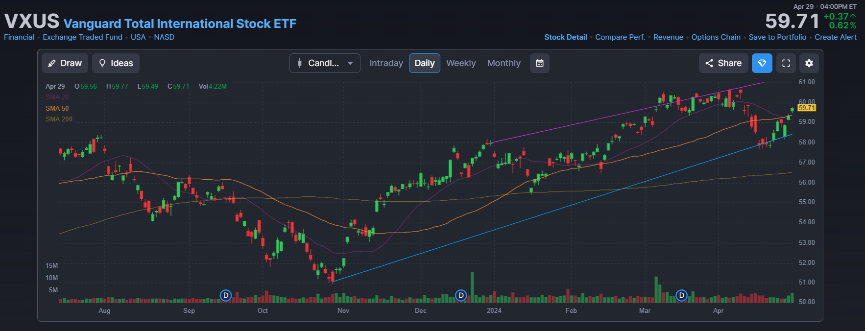 최근 글로벌 주식 투자자들에게 주목받고 있는 뱅가드의 해외주식 ETF(VXUS)는 현재 몇 가지 매력적인 요소가 있습니다: