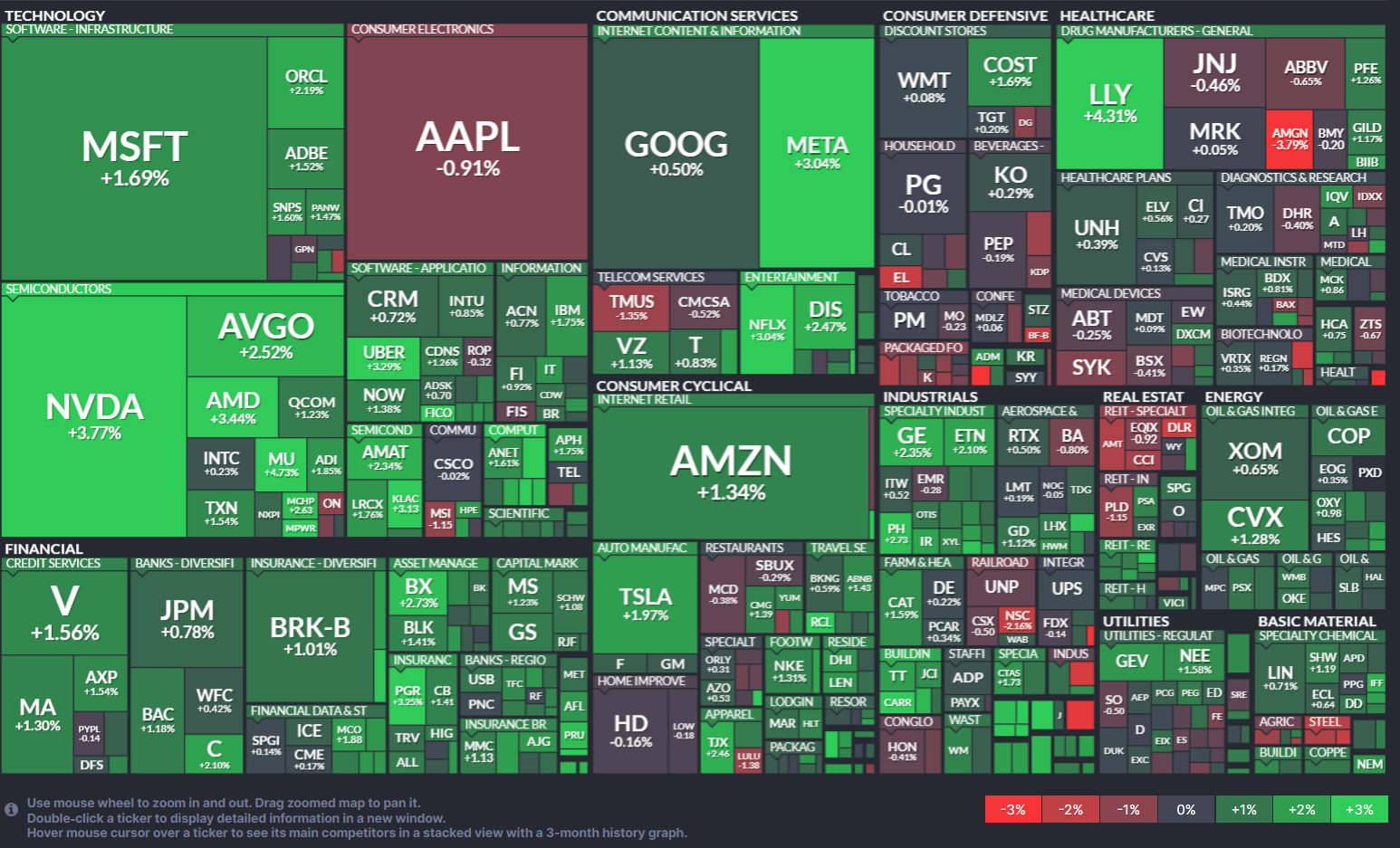 - 상승 주식: 엔비디아(3.77%), 메타(3.04%), 넷플릭스(3.04%), 마이크로소프트(1.69%), 테슬라(1.97%) 등