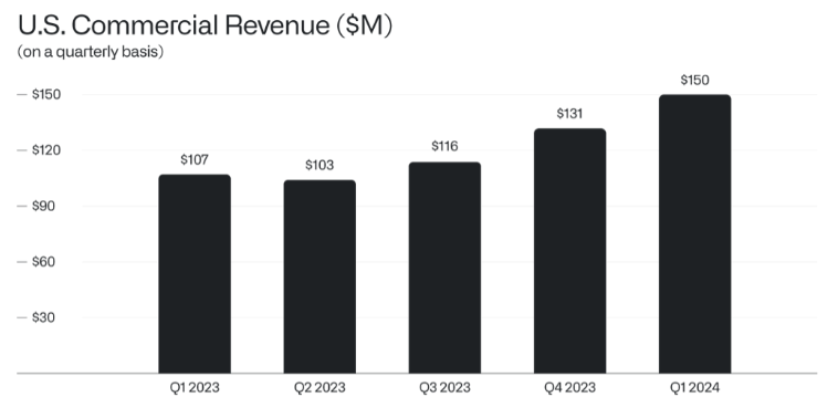 Palantir의 알렉스 카프 CEO는 1분기 실적 발표와 함께 공개된 주주 서한에서 "미국 상업 부문이 단기간 내 가장 큰 성장 동력이 될 것이다"라고 강조했습니다. 작년 4분기에 미국 상업 부문의 매출이 전체 매출의 24%를 차지했던 것을 언급했습니다.