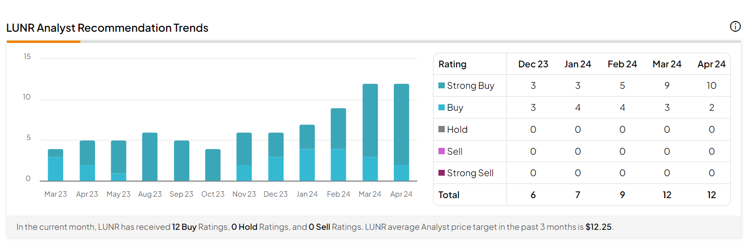 그러나 대다수 애널리스트들은 LUNR에 대해 '강력 매수' 의견을 제시하며, 12개월 목표주가를 $12.25로 전망했습니다. 이는 현재 주가 대비 121.92% 상승을 의미합니다.