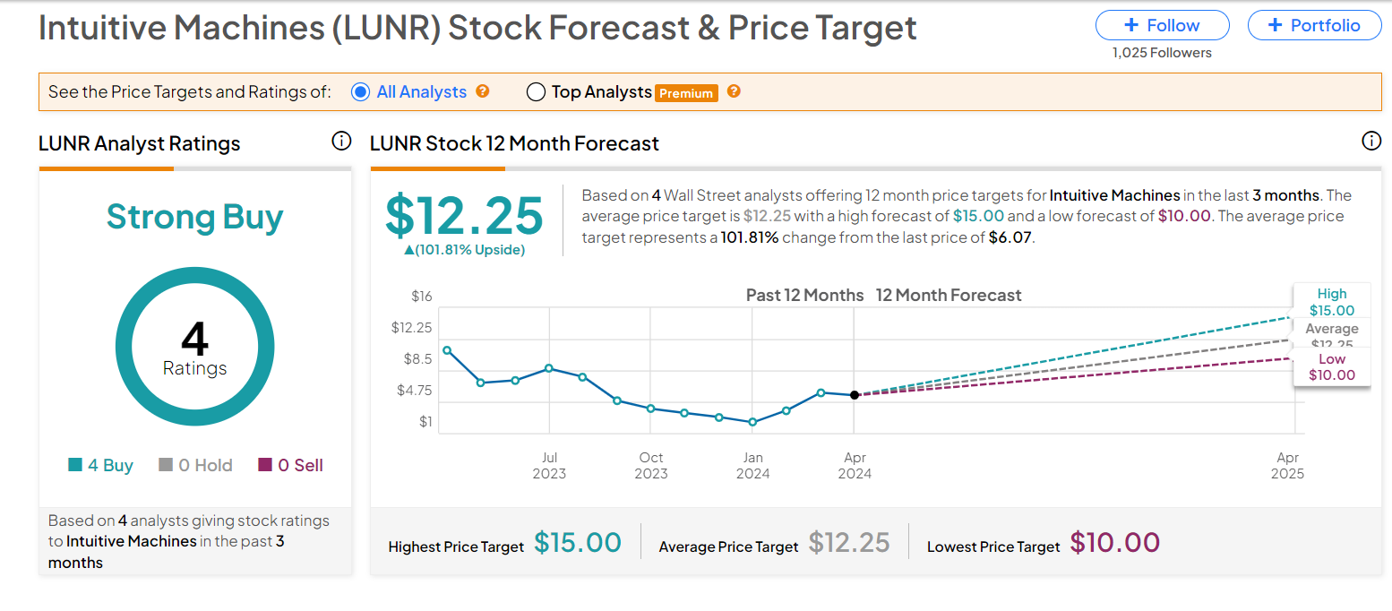다음 표는 Tipranks의 작년 12월 23일부터 올해 4월 24일까지 인튜이티브 머신즈의 전문가들의 매수 의견입니다. Strong Buy(강력매수)가 3에서 10으로 증가했음을 볼 수 있습니다.