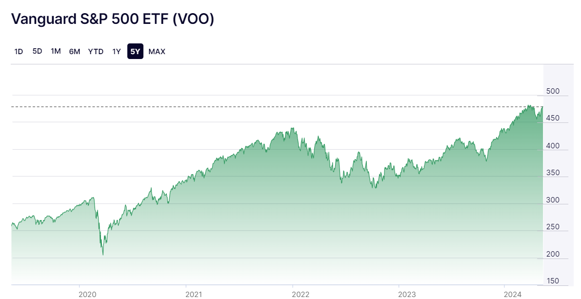 미국 경제에 투자하는 것과 가장 유사한 주식 시장 투자는 S&P 500 지수에 투자하는 것입니다. Vanguard S&P 500 ETF는 11개 주요 섹터를 포괄하는 500개 이상의 기업을 포함하여 시장 전체에 대한 노출을 제공합니다. 최근 12개월 동안 25% 이상 급등하며 사상 최고치에 근접했지만, 투자자들은 꾸준히 투자하는 데 집중해야 합니다. S&P 500 ETF에 대한 적립식 투자는 역사적으로 효과적인 투자 전략임이 입증되었습니다.