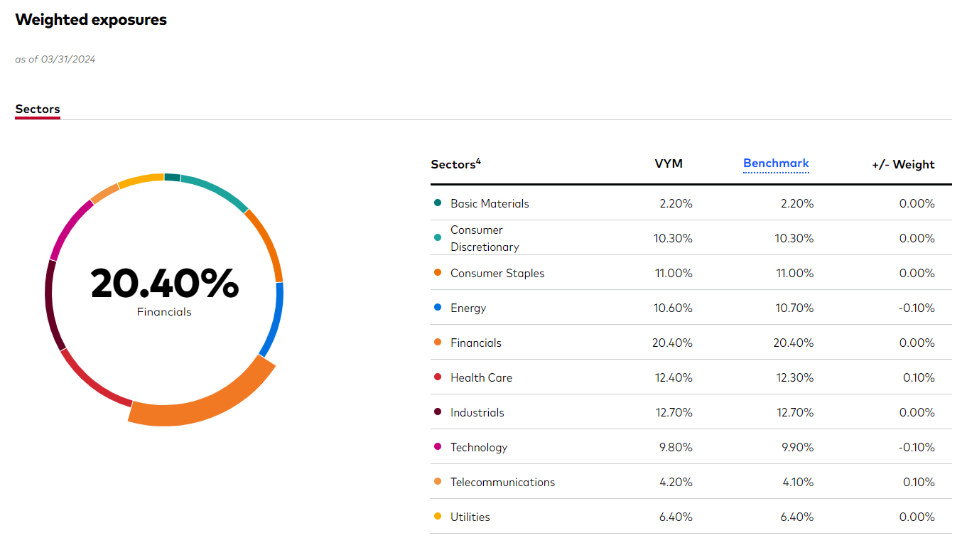 다음 도표는 2024년 3월 31일 기준 Vanguard High Dividend Yield ETF (VYM)의 섹터별 투자 비중을 보여줍니다.