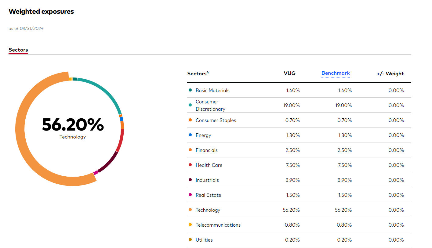 VUG는 성장 잠재력이 높은 대형주에 투자하는 ETF로, 기술 섹터에 대한 비중이 가장 높습니다. 이는 최근 몇 년간 기술주의 강세를 반영하며, 투자자들에게 높은 성장 가능성을 제공합니다. 하지만 특정 섹터에 대한 집중 투자는 위험을 수반할 수 있으므로, 투자 시 유의해야 합니다.
