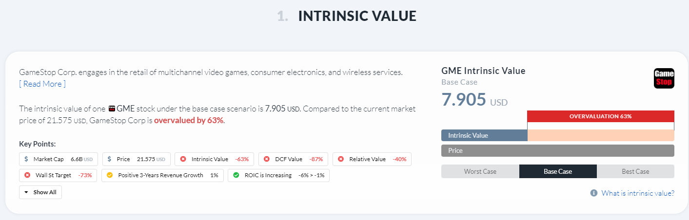 GameStop Corp (NYSE:GME) Intrinsic Valuation. Check if GME is overvalued or undervalued under the bear, base, and bull scenarios of the company's future.