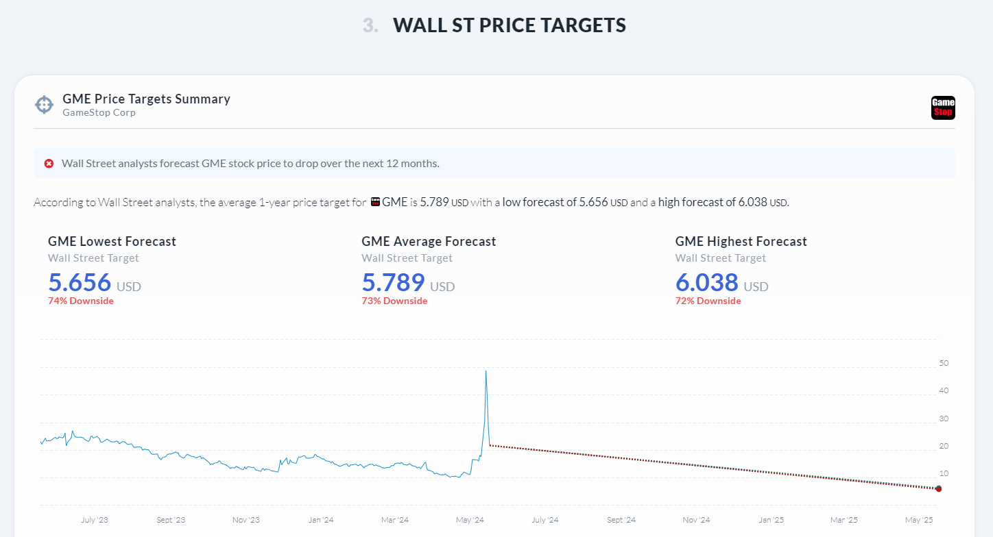 다음은 AlphaSpread의 Wall Street Price Targets 전망입니다. 월스트리트 애널리스트들은 GME의 1년 목표 주가를 평균 5.789달러로 예상하며, 최저 예상치는 5.656달러, 최고 예상치는 6.038달러입니다.