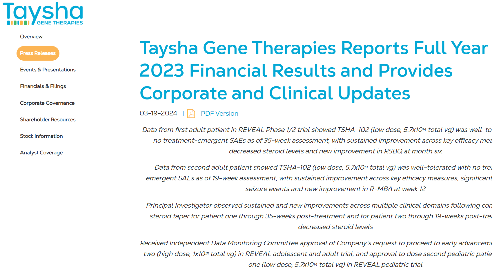 - 초기 임상 시험에서 TSHA-102의 안전성이 확보되었고, 환자들의 렛 증후군 증상이 지속적이고 의미 있게 개선되었습니다.