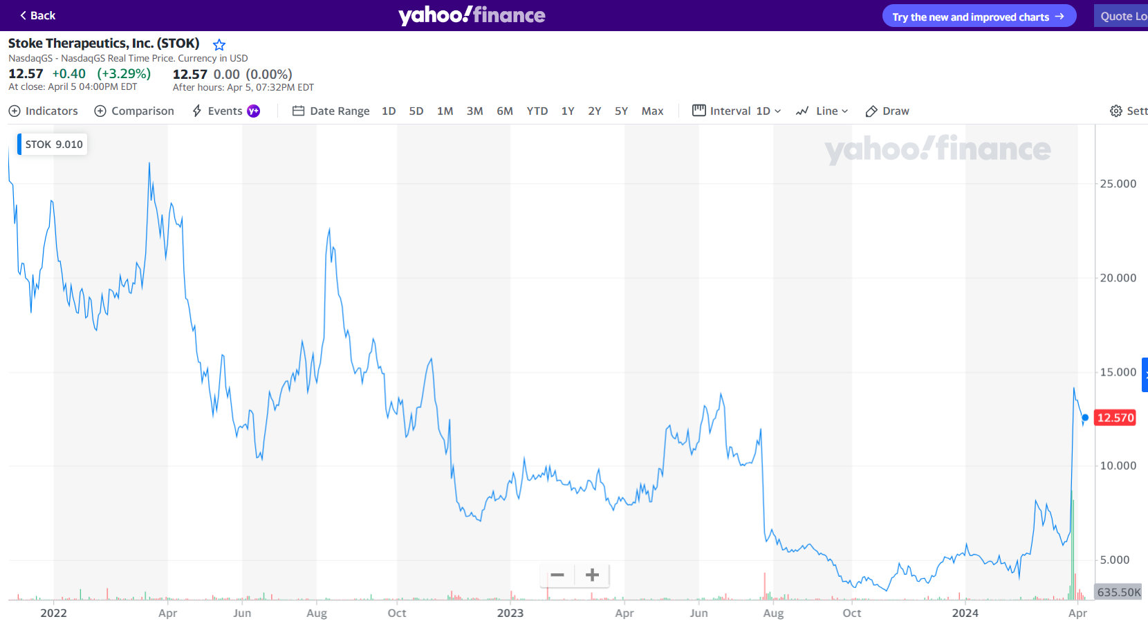 BEDFORD, Mass. --(BUSINESS WIRE)--Apr. 4, 2024-- Stoke Therapeutics, Inc. (Nasdaq: STOK), a biotechnology company dedicated to addressing the underlying cause of severe diseases by upregulating protein expression with RNA-based medicines, today announced t