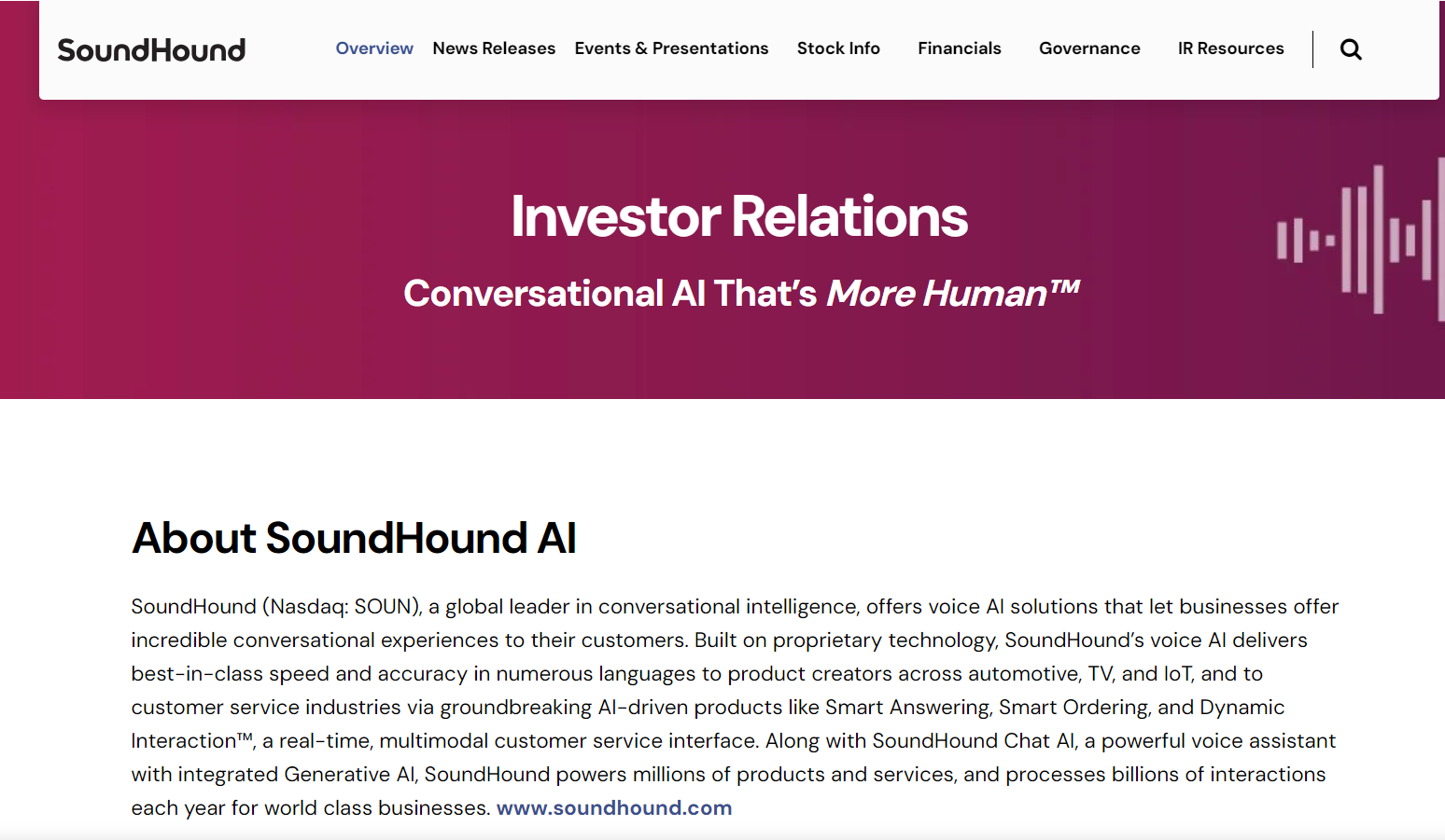 The Investor Relations website contains information about SoundHound AI's business for stockholders, potential investors, and financial analysts.