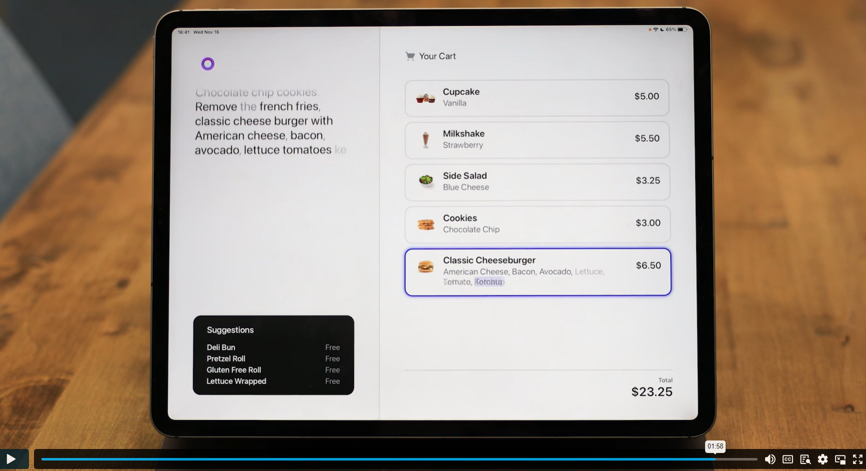 패스트푸드점에 도착한 손님이 영어로 주문을 합니다. 주문 하는 도중에 주문 넣었던 것을 바꾸거나 빼거나 수정하거나 하는 데도 불구하고 SoundHound AI 공식 사이트 동영상에 등장하는 이 시스템은 손님의 복잡한 음성 주문을 정확하게 인식한 뒤 실제로 최종 주문한 부분만 장바구니(Cart)에 넣어 놓습니다.