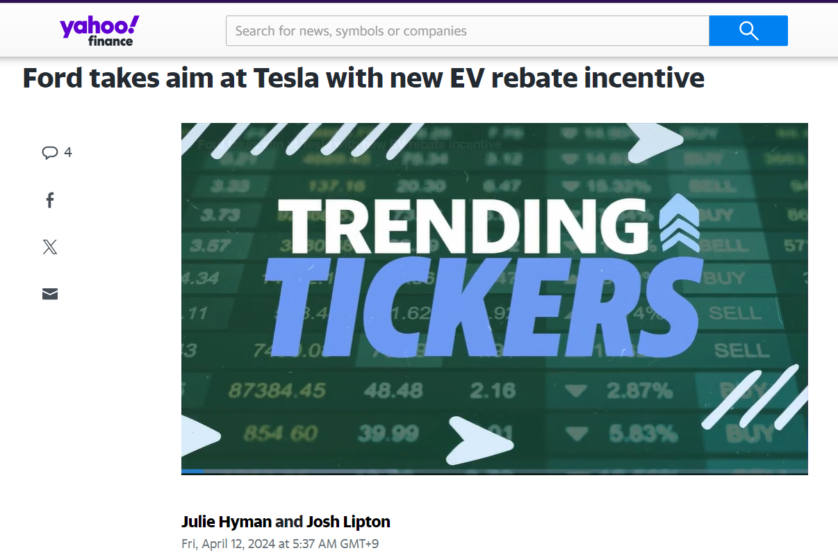 2. 포드가 테슬라를 타겟으로 삼아 : https://www.autoblog.com/2024/04/11/ford-targets-tesla-owners-with-1500-ev-conquest-rebate/