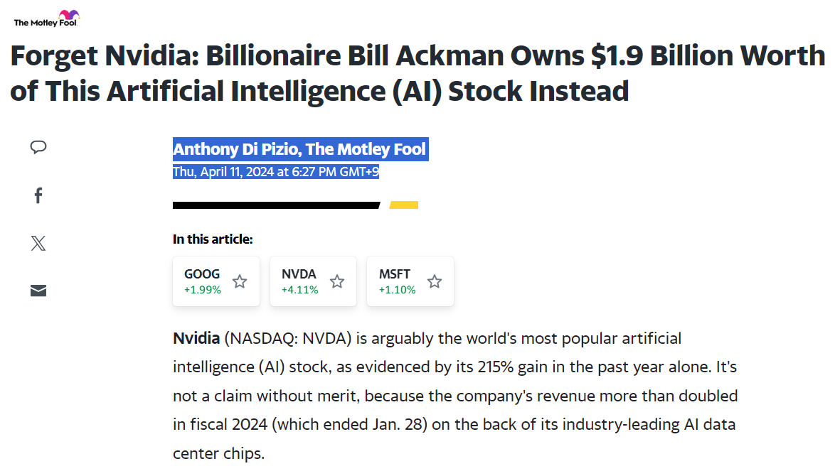빌 애크만은 엔비디아 주식을 전혀 보유하지 않고 대신 알파벳(Alphabet) 주식에 19억 달러를 투자했습니다.
