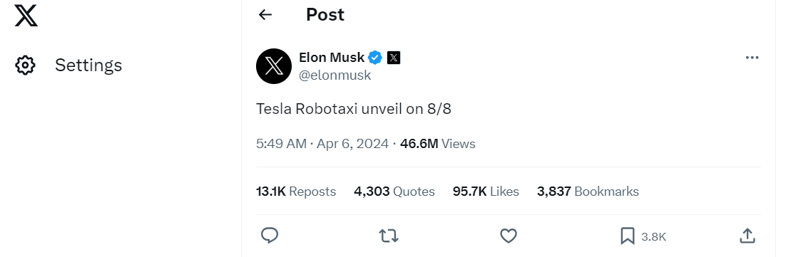 테슬라의 CEO인 일론 머스크는 X를 통해 회사가 8월 8일에 로보택시 제품을 공개할 것이라고 발표했습니다. 머스크는 수년간 주주들에게 로보택시를 약속해 왔지만 아직까지 자율주행 기술에 대한 그의 약속을 이행하지 못했습니다. 이 로보택시 공개 일정 발표는 회사 성장이 둔화되고 있는 시기에 일부 투자자들의 회의적인 시각이 커지면서 나온 움직임입니다.