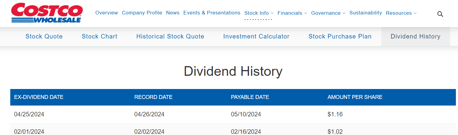 3. 코스트코 배당금 정보: https://investor.costco.com/stock-info/dividend-history/default.aspx