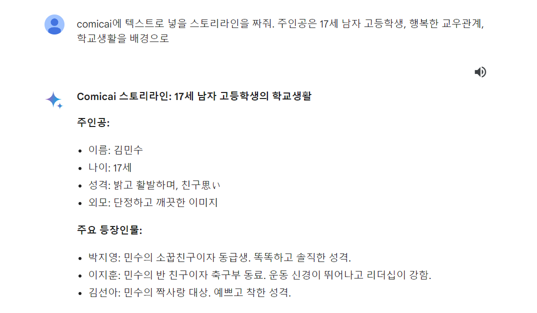 Google Gemini에게 Comicai에 넣을 스토리라인을 다음과 같은 내용으로 구성해 달라고 부탁해 보았습니다.