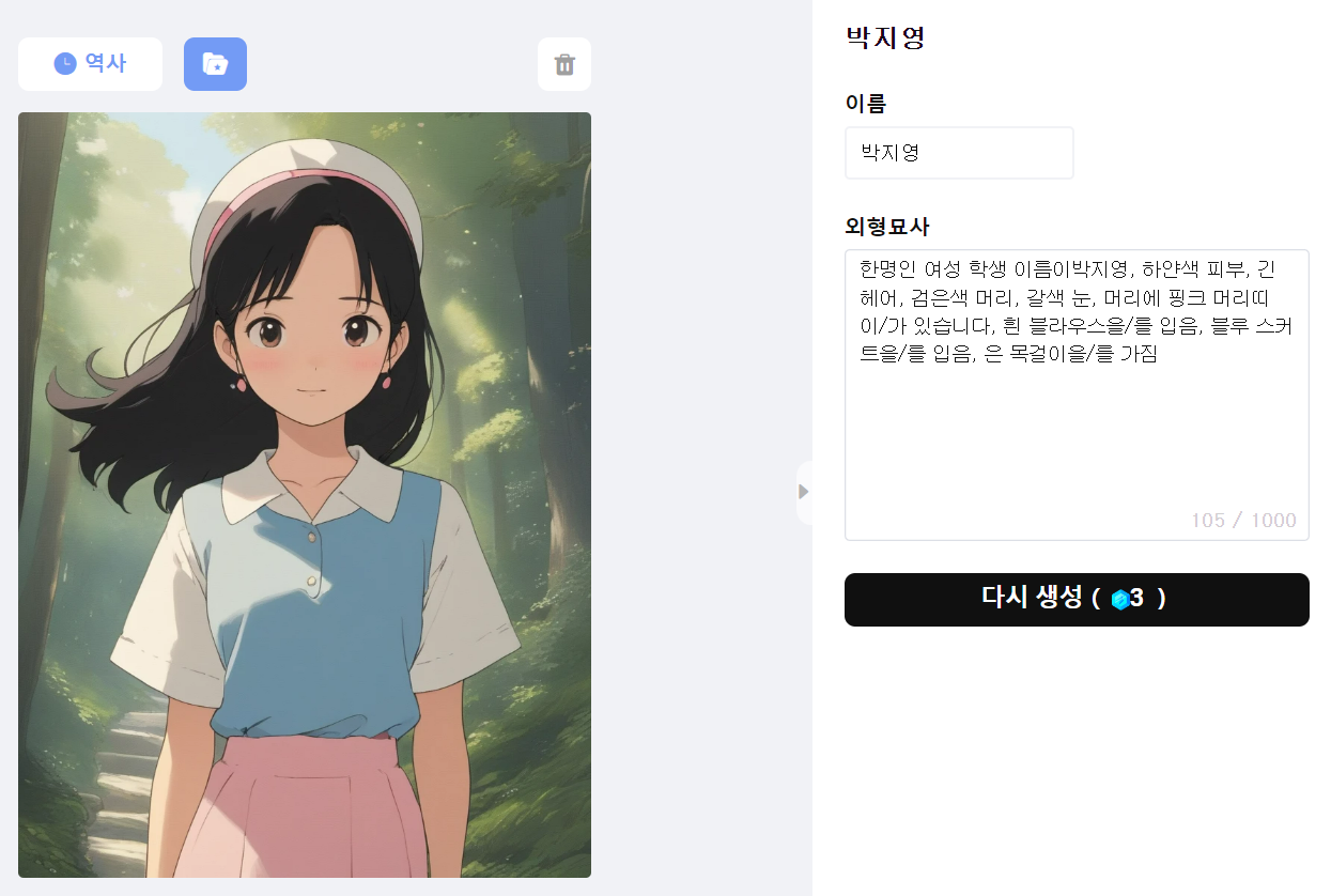 저는 지브리 스튜디오의 느낌으로 만들어 보고 싶어서, 해당 스타일을 선택했더니 다음과 같이 박지영, 김선아, 최연우, 김민수, 이지훈의 캐릭터를 만들어주었네요.