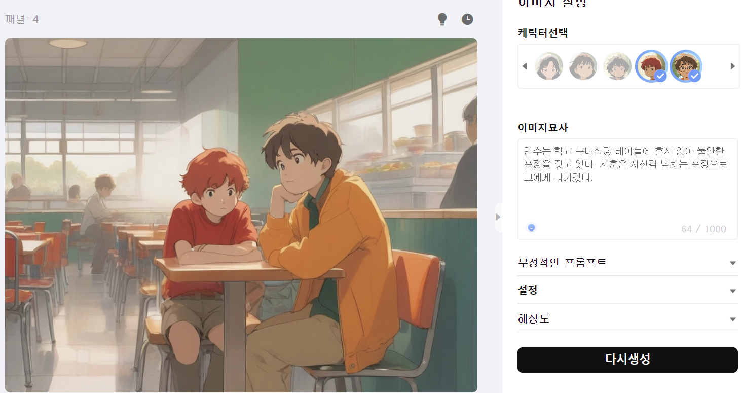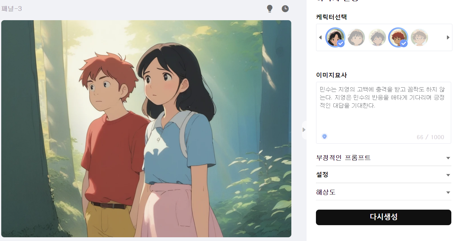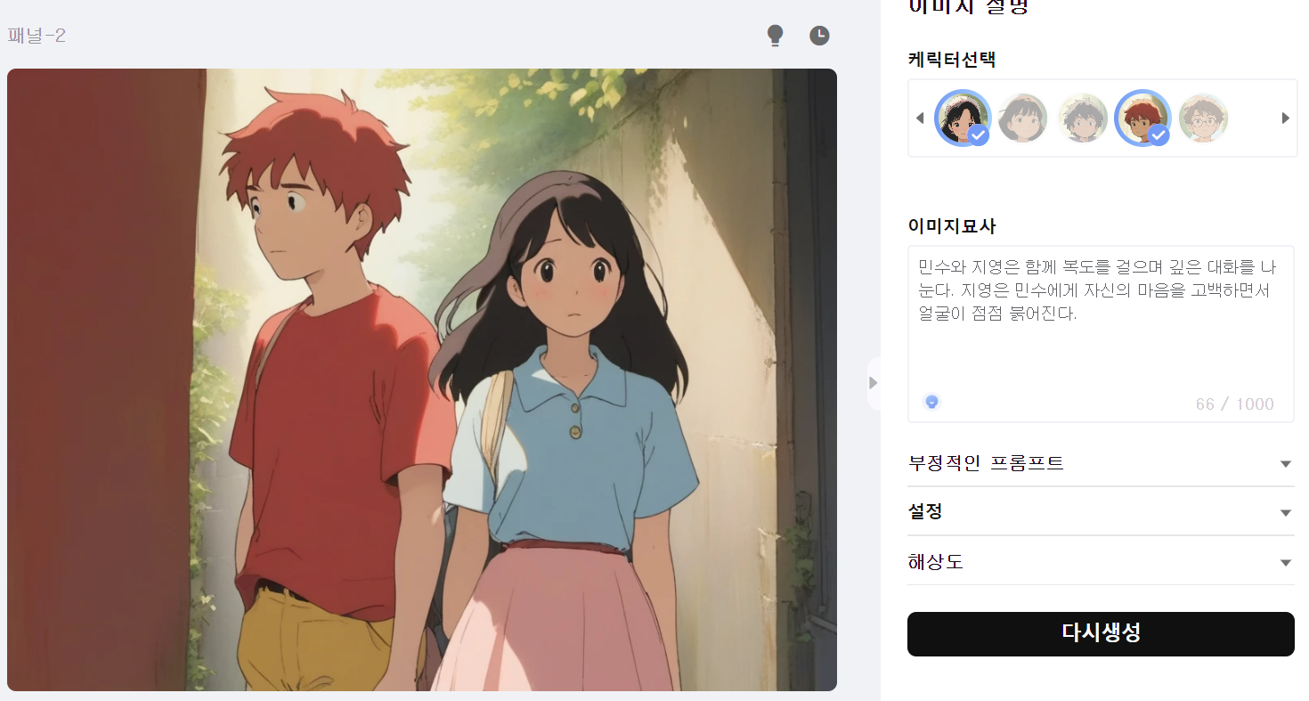 좀더 구체적인 스토리라인을 구성하고, 다시 생성을 누르면 더욱 훌륭한 작품을 만들 수 있을 것 같습니다.