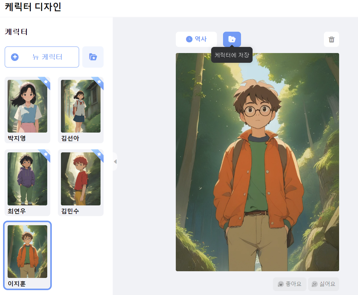 다시 캐릭터 디자인을 돌아간 후, 생성되어 있던 캐릭터를 먼저 각각 저장했습니다. 아래 이미지에 보이는 "캐릭터에 저장" 이라고 된 폴더 아이콘을 클릭하면, 각각의 캐릭터가 저장되면서 캐릭터 우측 상단에 파란 띠와 하얀 별표 모양이 생성됩니다.